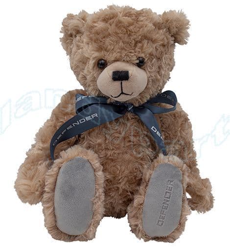 Ultra-soft teddy bear featuring a branded ribbon neck tie and embroidered Defender